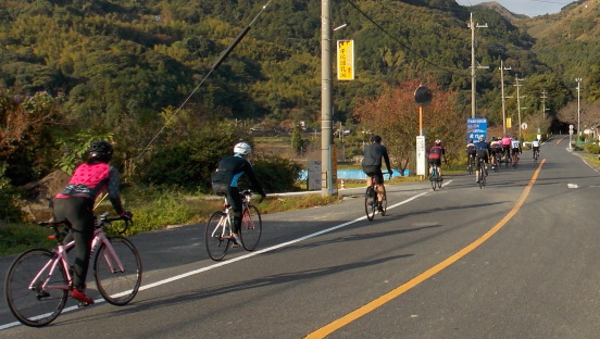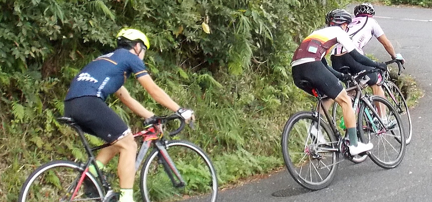 先頭を陣取るのは右からベテランの河本選手と鈴木選手、ピンクのジャージは前田選手と中村やすし選手。