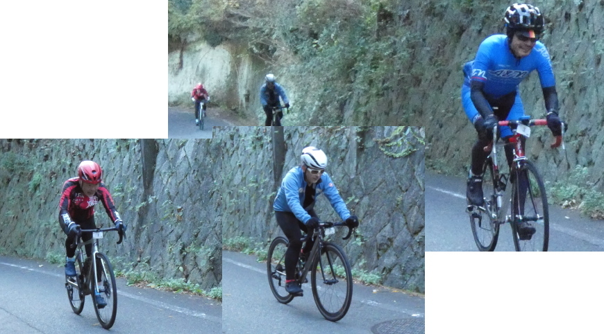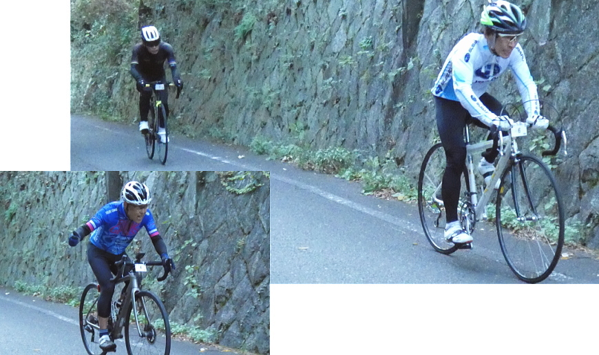 この上り勾配の大きいカーブを曲がると急に舗装状態が悪く、枯葉だらけのコースに変貌します